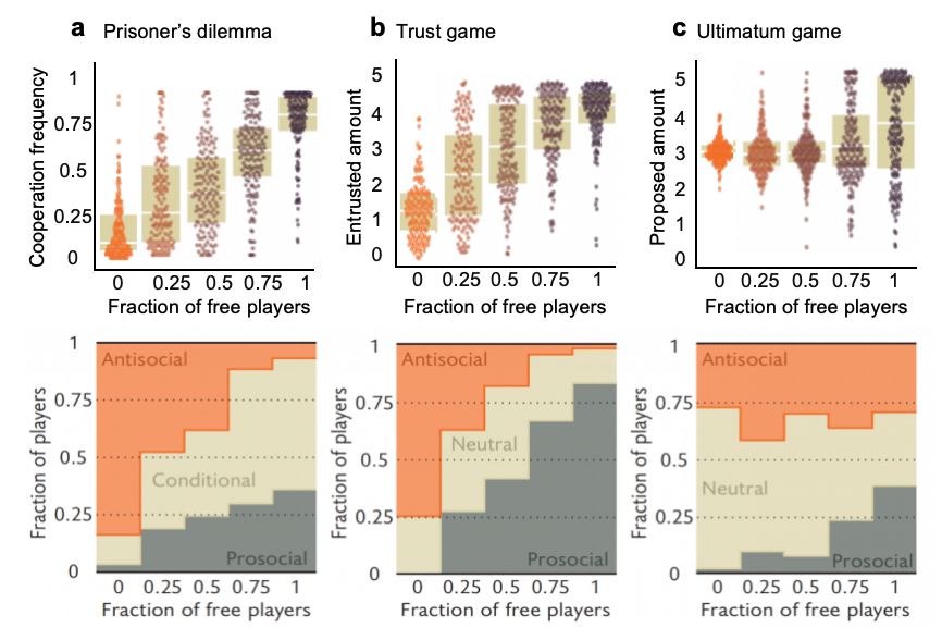 当今世界,广泛存在的博弈交互行为(合作、竞争、对抗等)已经成为各类系统稳定运行的基础。应运而生的博弈智能则通过对博弈关系的精准建模、求解、优化,进而形成决策知识库,成为助力国家人工智能战略和航空航天重大工程的重要基础理论。然而,现有研究难以充分解释大规模智能体、多元交互等复杂场景中合作涌现的内在机理和演化规律。针对这一挑战,黄色电影 王震教授团队研究了多元决策模式的大规模行为博弈,首次揭示了社交网络能动性(即增加网络中博弈智能体的决策自由度)可以显著激发群体合作、信任与公平等亲社会行为,为完善群体智能涌现理论提供了更充分的科学依据。最新研究成果以 Social networking agency and prosociality are inextricably linked in economic games 为题发表在Nature Human Behaviour 。