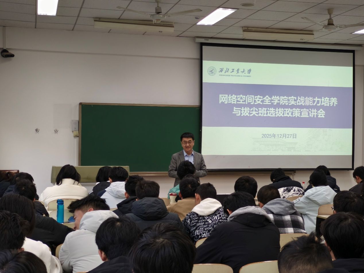 会上宣讲了网安拔尖班的选拔办法、考核机制、动态管理模式等。拔尖班实施动态管理制度,每年进行人员调整,实行优胜劣汰,以保持拔尖班的活力与培养质量。在培养方案方面,拔尖班突出“实战导向、创新驱动、高阶要求”的特色,不仅课程设置兼顾前沿性与高阶性,还注重实战创新能力培育,并将引入企业师资、搭建校际交流平台,全力拓展学生学术视野与综合素养。学院致力于培养具备卓越实战对抗能力和系统创新能力的“总师型”网安高素质专业人才。拔尖班是一块实验田,帮助学院探索与培养目标相匹配的培养体系。