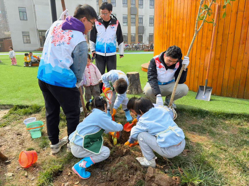 志愿者与幼儿园小朋友共同栽种树苗
