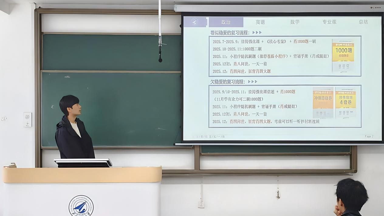分享会上,三位学长依次发言,各有侧重。耿翊轩率先从政治学科入手,指出政治备考不必过早启动,建议从9月起集中刷题,重点利用小程序进行错题重刷,并强调大题写满的重要性。随后,他结合英语、数学和专业课的复习节奏,详细介绍了各阶段的时间分配与资料选择,特别提醒同学们不要被模拟卷的低正确率吓倒,保持平稳心态才是关键。张睿则从“单词为王”切入,分享了自己从基础薄弱到英语二取得高分的逆袭经历,强调单词背诵和真题精读的核心地位。他还就数学的基础强化、模拟卷使用、错题整理等环节给出了具体建议,并呼吁同学们避免盲目比较进度,注重长期坚持。余金陶最后发言,他重点介绍了专业课的复习路径,推荐了湖科大视频课程与“凤凰考研”题库,并结合自身经验,提醒大家在复习过程中及时截图整理知识点,便于后续快速检索和查漏补缺。