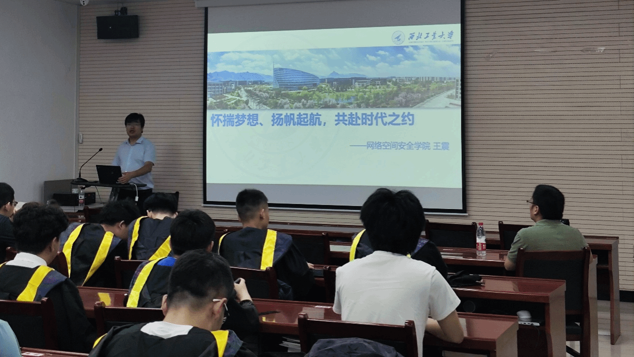 然后,学院常务副院长张盛兵做了讲话。张盛兵院长向同学们讲述了网络安全领域面临的严峻形势和广阔的发展前景,鼓励同学们“做实事”,勇担责任,勇于挑战自己。最后他向同学们说:“无论你们走到哪,你们永远是网安学院的孩子,是西工大的学生。”关爱与不舍之情溢于言表,表达了对同学们的美好祝福和殷切希望。