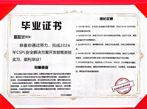 董顺宇曾在知名企业的安全研究团队实习,深入接触密码学在工业界的实际应用,积累工程经验,提升理论落地能力,为未来的职业发展奠定坚实基础。