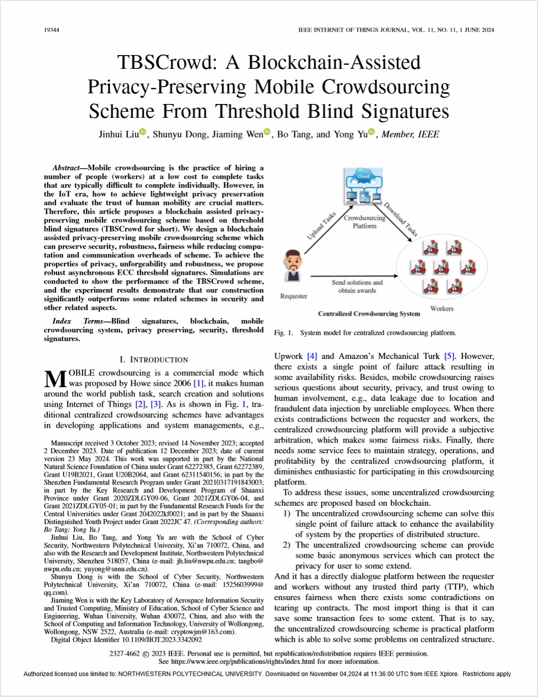 Assisted Privacy-Preserving Mobile Crowdsourcing Scheme From Threshold Blind Signatures》学生一作,发表于IoTJ(中科院SCI一区)