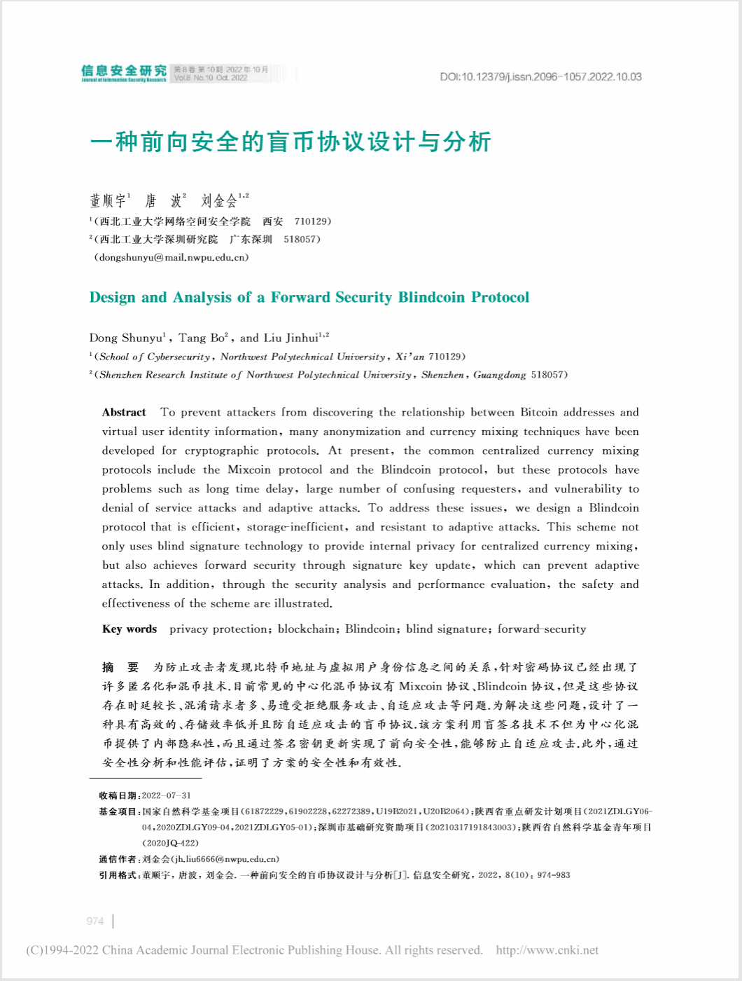 ·《一种前向安全的盲币协议设计与分析》第一作者,发表于信息安全研究期刊(北大核心)