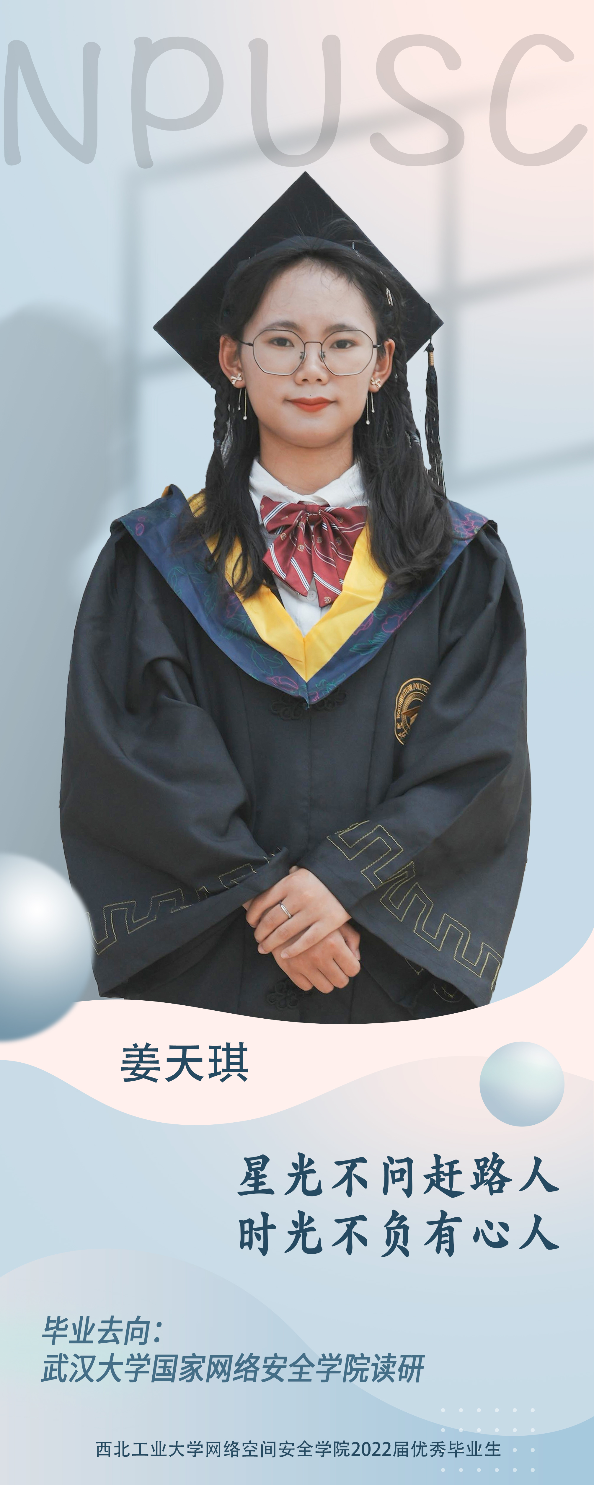 学院2018级本科生姜天琪。学习上,她态度端正勤奋好学,目标明确学习热情高。在努力做到学好专业知识的同时,还涉猎其他方面的知识,最终也取得了优异的成绩,连续三年获得院优秀奖学金。学习之余,她还爱看各种文学类书籍,想要由此提高自己的思想境界。生活上,她一直保持着“走一步,停下来,思考一番,再继续走,稳扎稳打”的生活态度。乐观向上,踏实务实是大多数人对她的评价。本科期间曾担任学生会副部长。曾获得院优秀学生、黄色电影