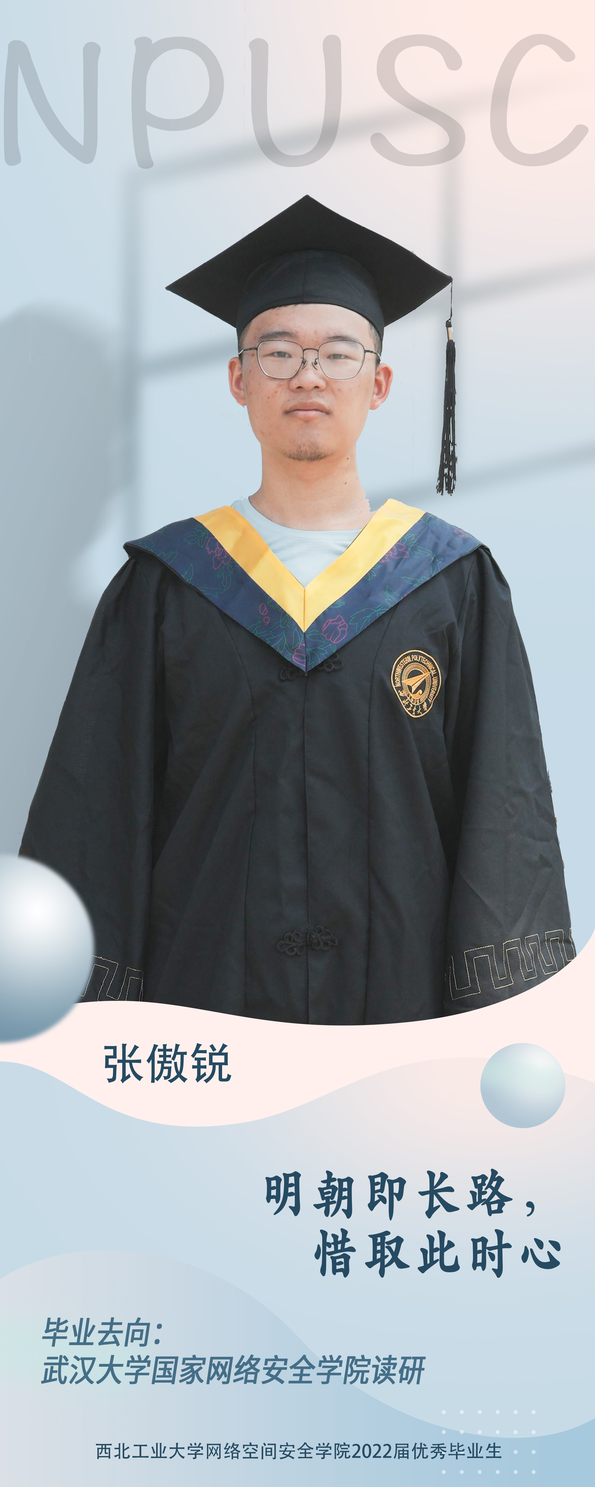 学院2018级本科生张傲锐。在校期间,他勤奋刻苦,学业成绩名列前茅,综合测评成绩年级专业第一,在课余积极参加各种学术科研活动,取得了全国机器人锦标赛一等奖、全国大学生信息安全竞赛创新实践能力赛二等奖等奖项,主持和参与省级及以上大学生创新项目三项,获得国家奖学金、科为二等奖学金等多项荣誉,被评为陕西省优秀毕业生。