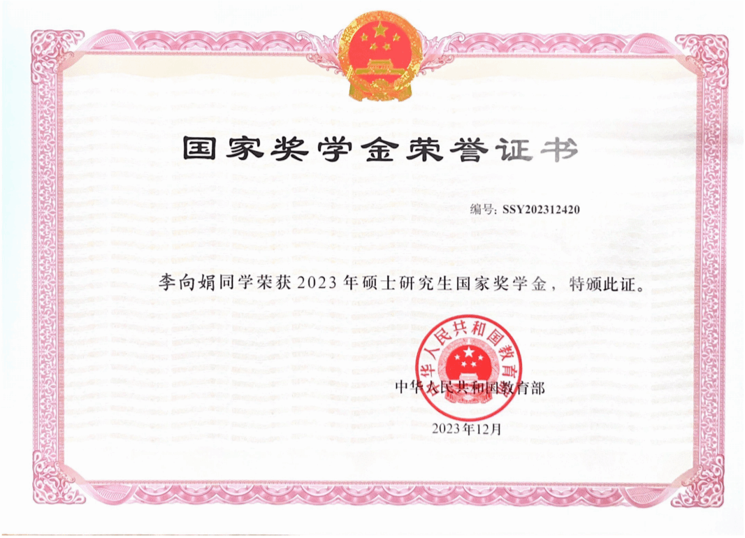 在学习上,李向娟勤奋刻苦、开拓创新,努力夯实理论基础,踔厉奋发科研高峰。大四推免至本校继续攻读硕士学位,研一学年必修课学分积91.93(排名1/92),目前已发表高水平论文2篇,申请发明专利1项,主持校内基金项目2项并顺利结题。她积极参加国内外学术会议、与国外课题组交流研讨,以不断拓展视野、力求创新。