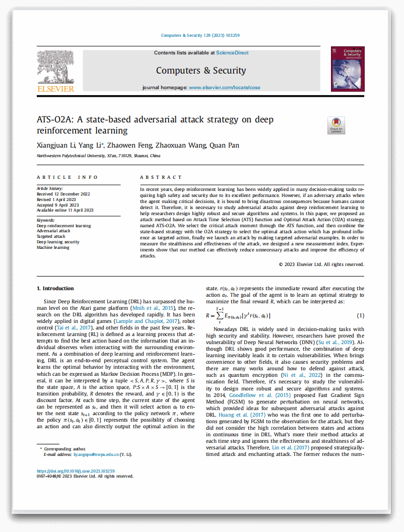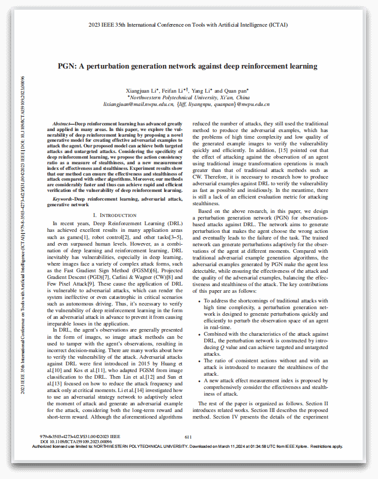 研究生会主席团成员、网安学院学生第四党支部副书记兼组织委员。研究方向为深度强化学习算法的脆弱性与鲁棒性,硕士期间以第一作者发表高水平论文2篇,申请发明专利1项,作为项目负责人主持校内基金项目2项,获国家奖学金等各类奖学金7次,获优秀研究生等荣誉称号5次,参加“互联网+”等各类竞赛获奖5次。 |