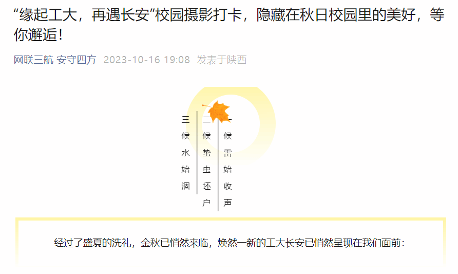 学生摄影学会共同举办了名为“缘起工大,再遇长安”的校园摄影打卡活动。此次活动以校园摄影为媒介,为同学们提供一个展现自我、感受校园文化的机会,既帮助了新同学们快速熟悉校园环境,又带领同学感受到工大校园浓厚的人文气息。