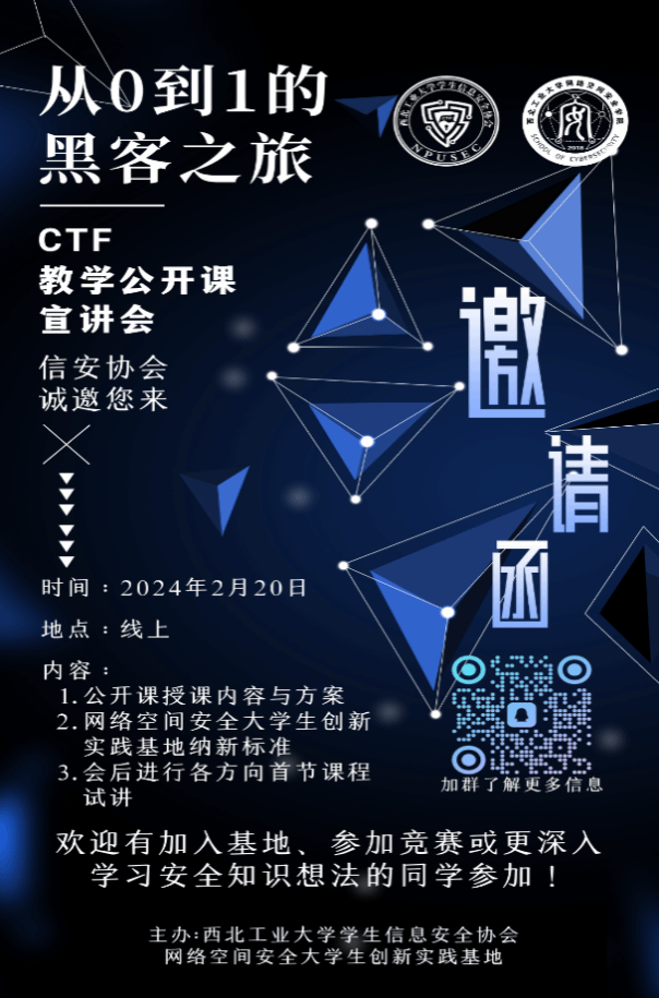 新生手册》,字数达15000+,覆盖学习、生活、学生工作、综测等各方面,帮助网安学子“扣好”大学的第一粒扣子。打造“网小安”直播间,邀请优秀网安学子,围绕微积分、计算机系统基础等课程学习以及校园成长等方面的问题为同学们解答疑惑;面向全校举办“恋爱主题讲座”,引导同学们树立正确的恋爱观,实现“德智体美劳“全面发展;打造网安特色CTF教学公开课,面向全校同学讲解相关专业知识,普及学科基础,提高竞赛参与度,实现以赛促学。持续举办考研、保研、就业经验分享会,全方位答疑解惑,助力网安学子升学、就业。文体活动方面多点开花,学院学生辩论队获“精英杯”辩论赛冠军,校篮球赛亚军、校运动会篮球项目亚军。积极联合兄弟学院开展科创文化节、迎新晚会等活动,备受同学好评。