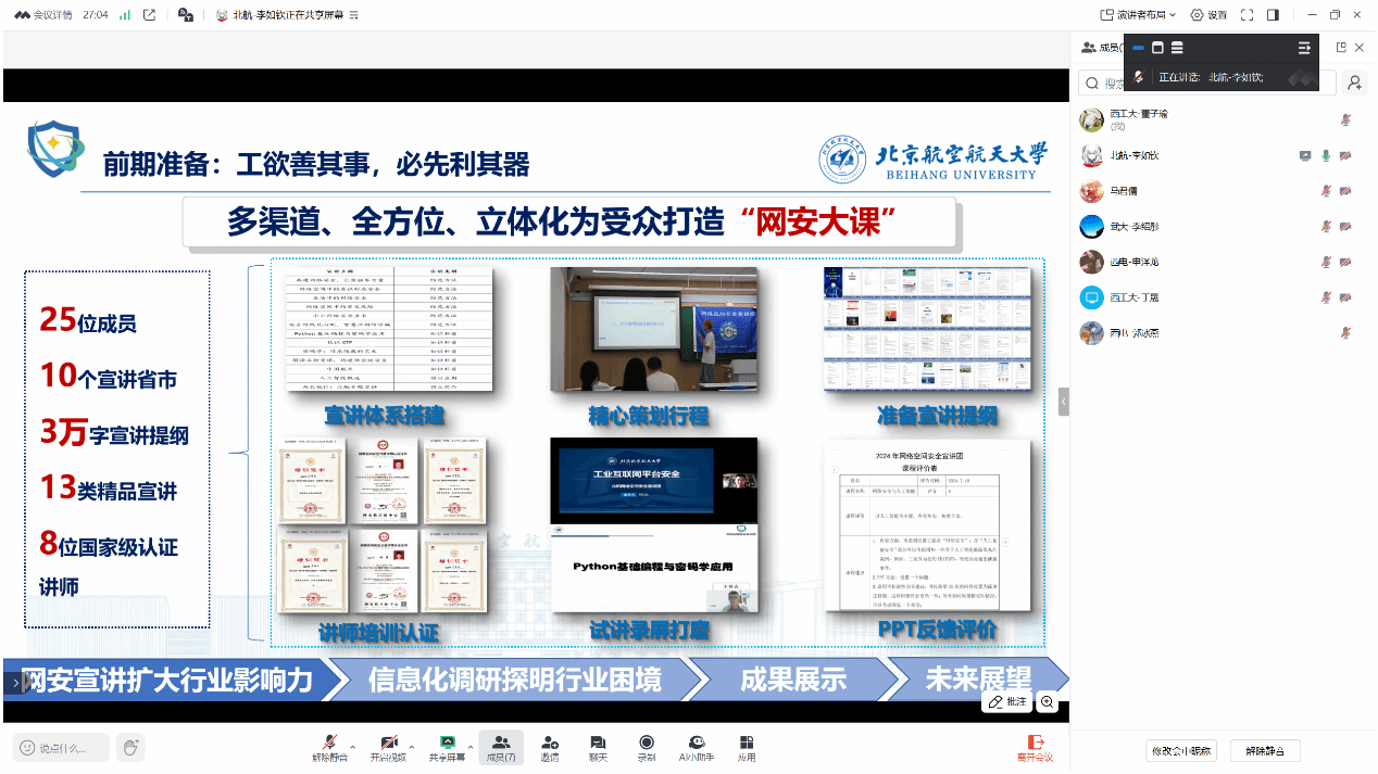 紧接着,北京航空航天大学黄色电影 主席团成员李如钦介绍了北航网安学院学生会在2024年度的各项工作成果。在主席团的统筹协调下,学生会各部门分工合作,成功举办了多项与校学生会、北京学联的联合活动,创新性地开展了航空航天嘉年华等特色活动,极大丰富了同学们的校园文化生活。同时,北航的网络空间安全宣讲团在暑假期间走进了多个省市,开展了广泛而深入的宣讲活动,同时也围绕网络安全行业的落地现状进行了调研,为全国多个地方建立网络空间安全基地,提高了公众的网络安全意识。此外还在科技成果和宣传活动方面有所建树。