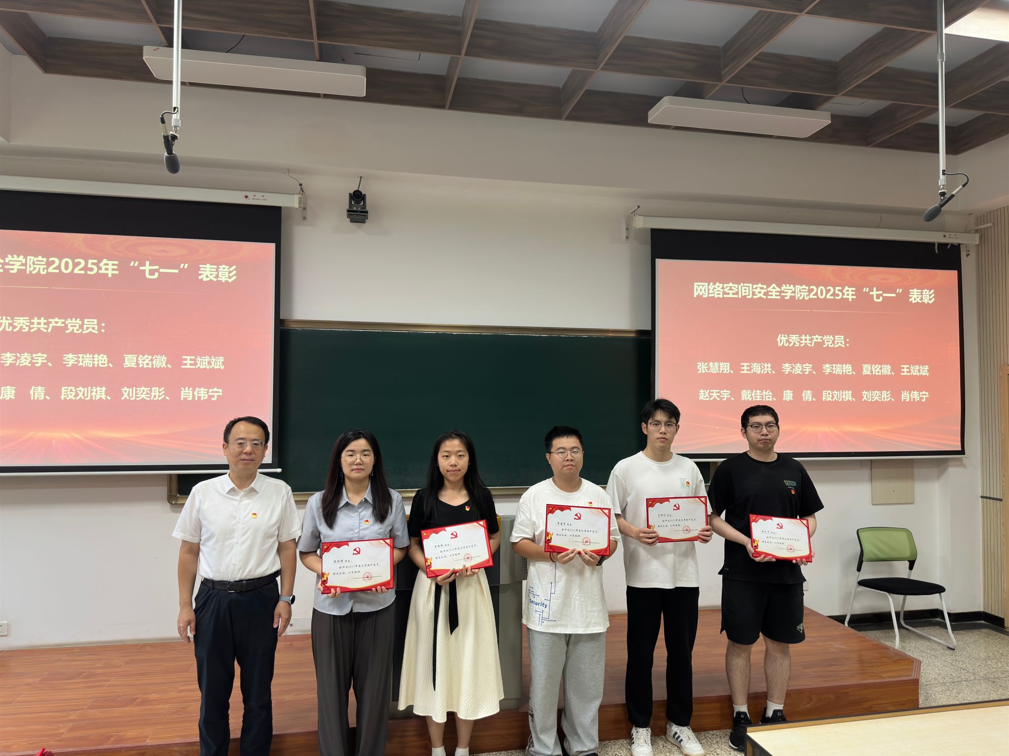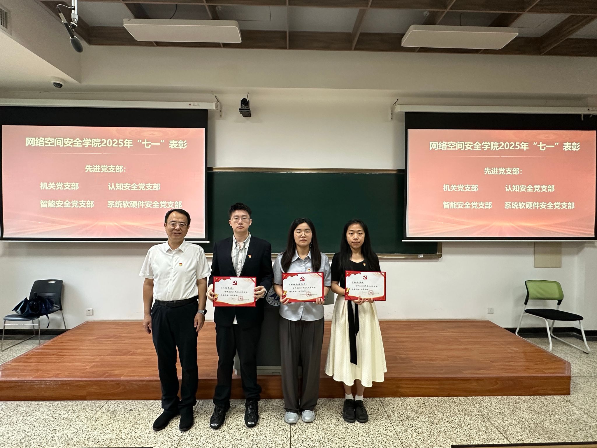 接下来进行的是“七一”表彰环节。主持人宣读了表彰决定,对过去一年中在学院各项工作中表现突出的优秀共产党员、优秀党务工作者和先进党支部进行表彰。与会领导分别为获奖个人和集体颁发荣誉证书,以表彰他们在党的建设、人才培养、学科建设等方面所做出的突出贡献。