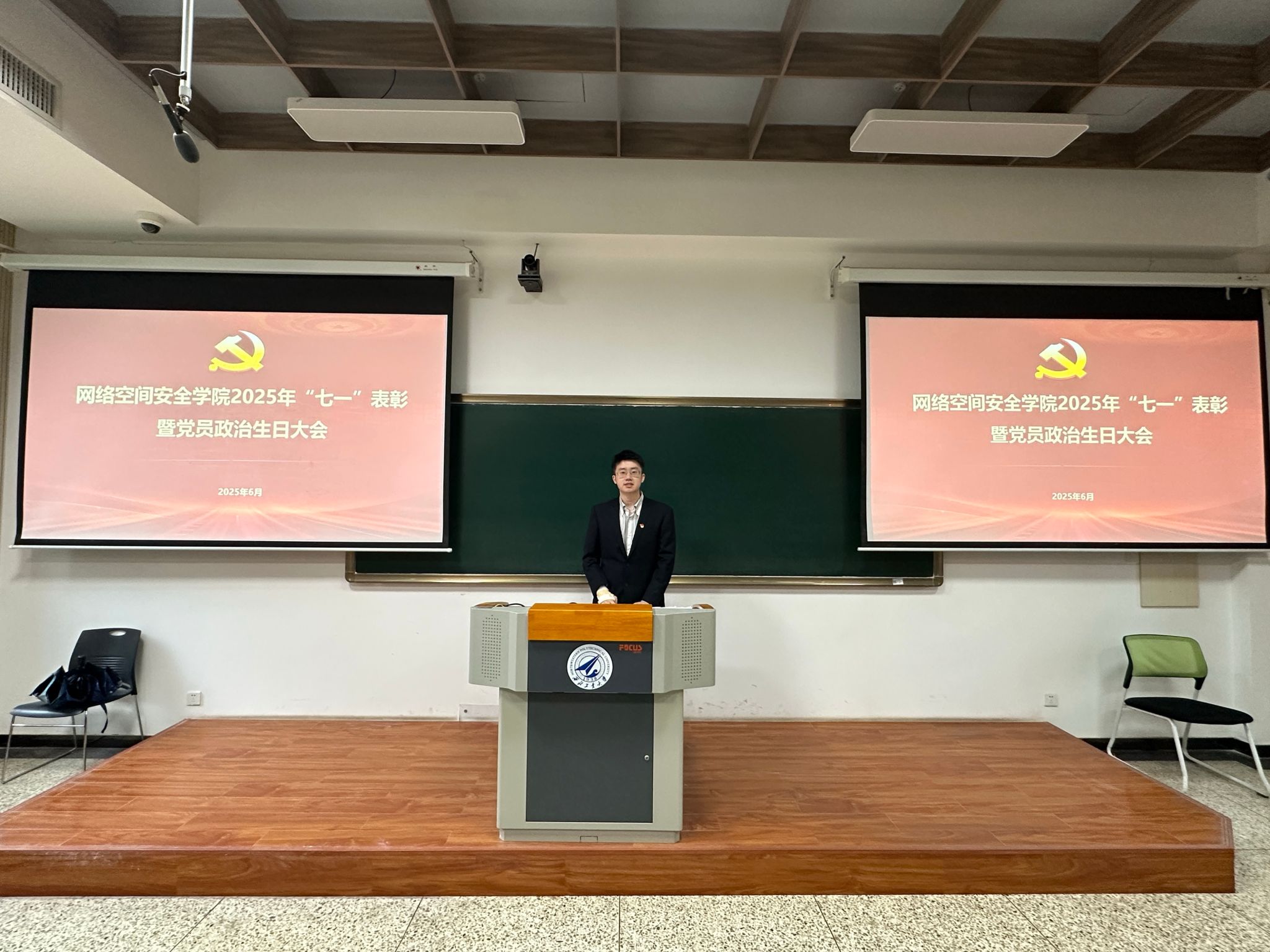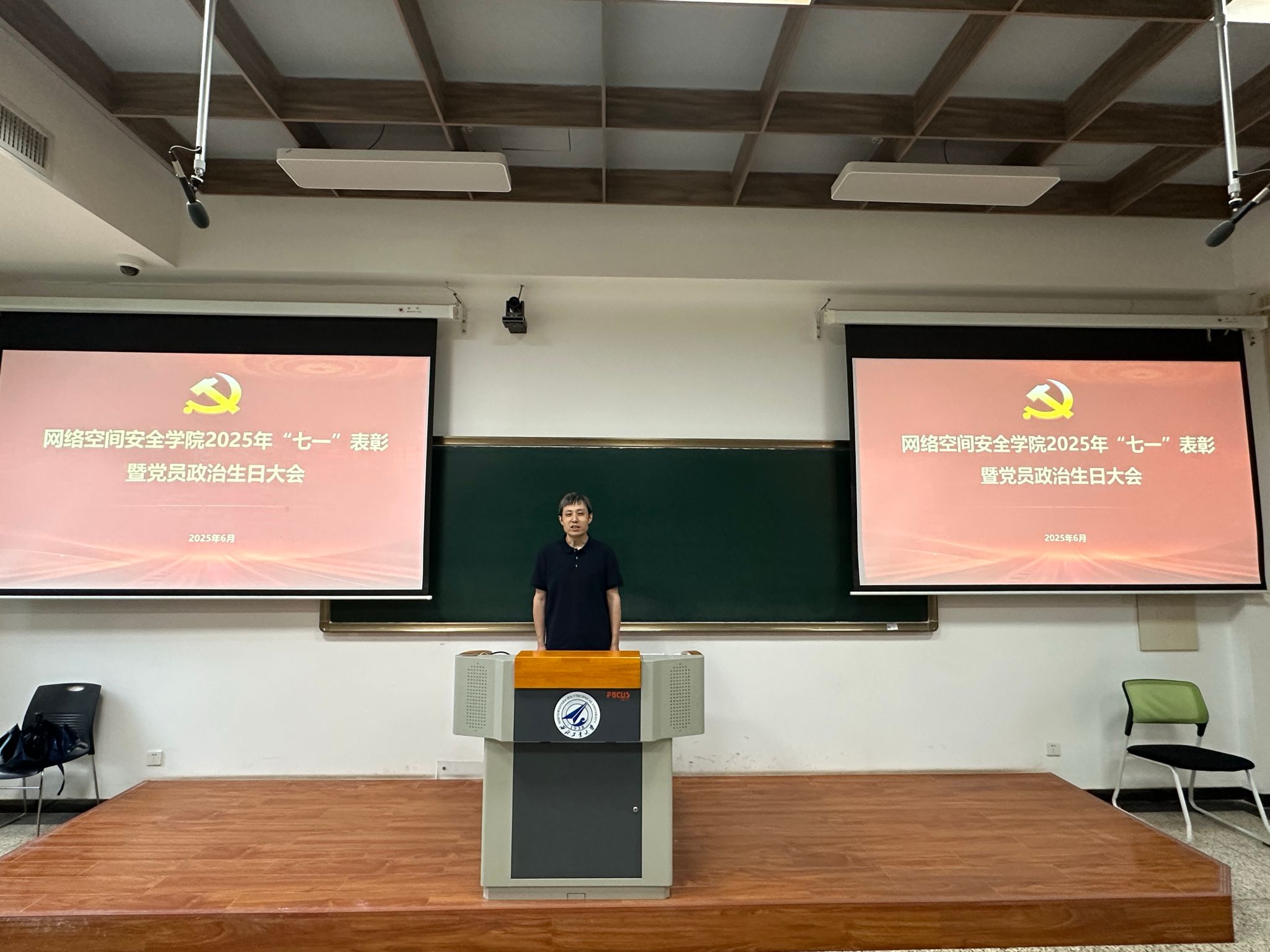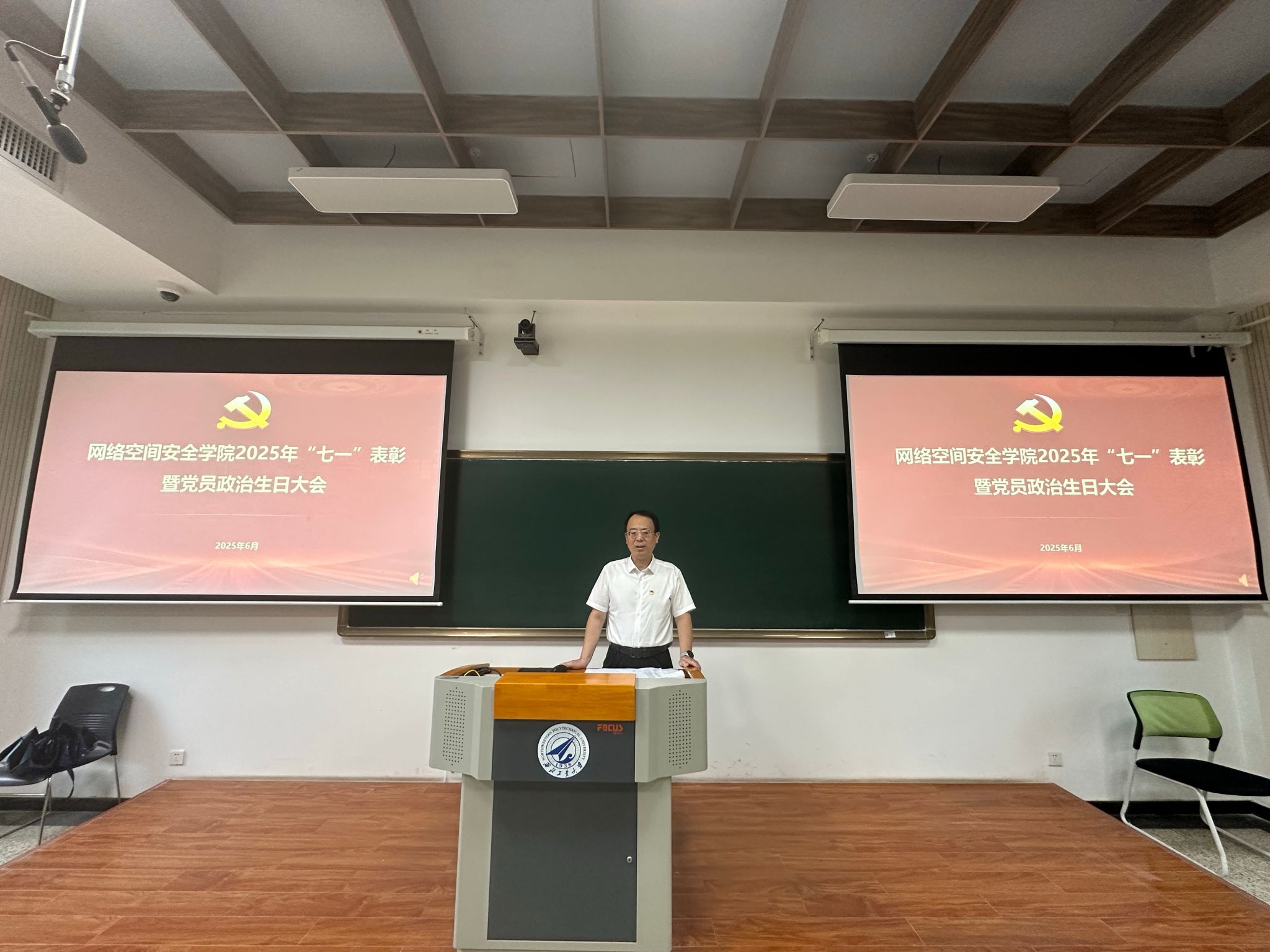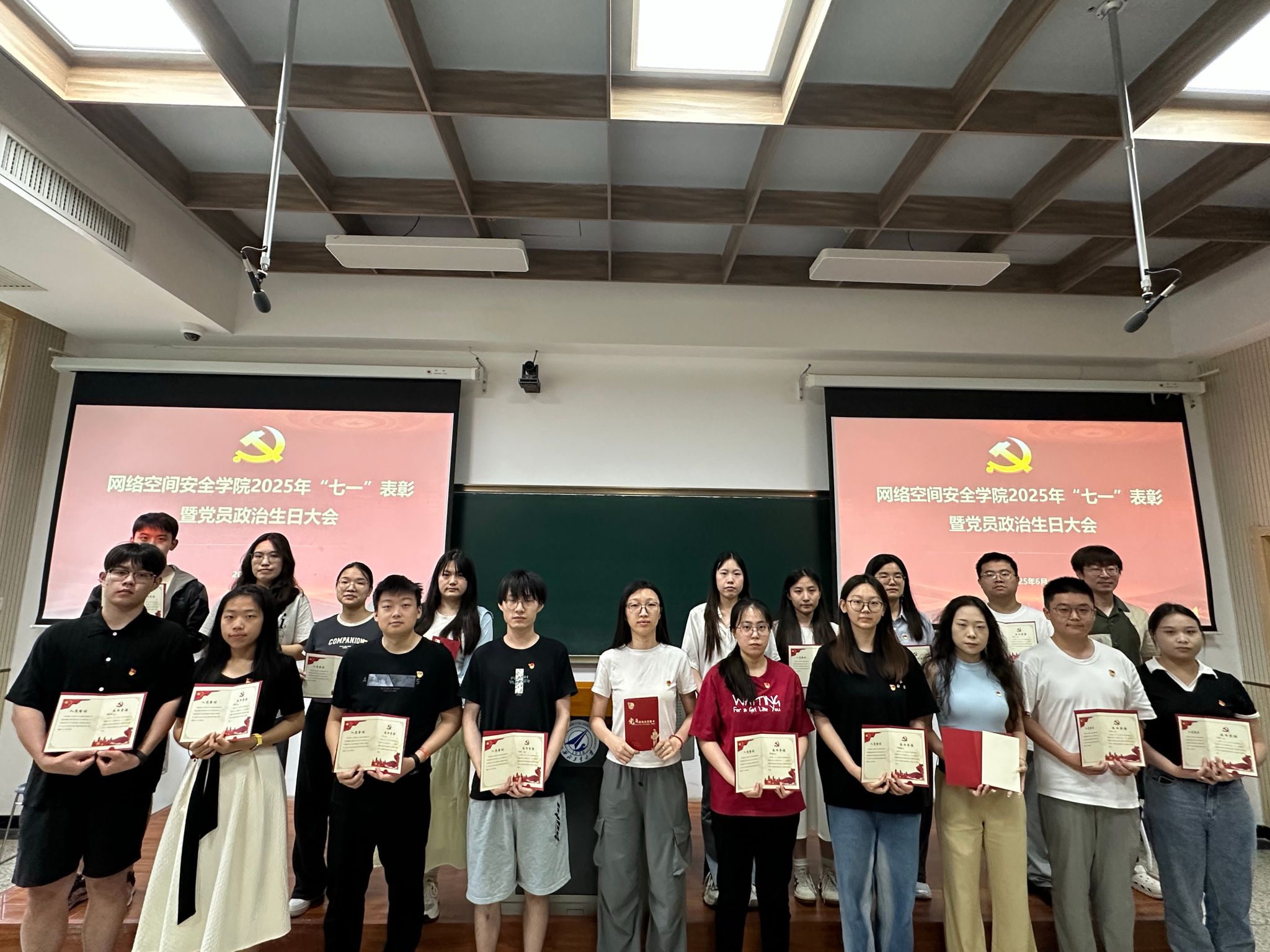 于2025年6月30日上午在长安校区隆重举行“七一”表彰暨党员政治生日大会。学院党委委员、受表彰个人和集体以及师生党员代表参加了此次大会,大会由学院党委副书记杜瑶主持。