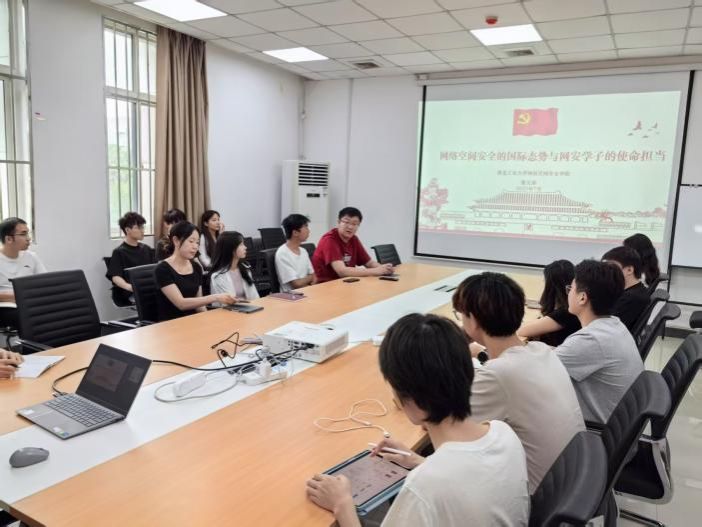 党委书记张文涛以“网络空间安全的国际态势与网安学子使命担当”为题,为学生党支部讲授专题党课,带领网安学子深入剖析当前网络空间安全领域的国际格局,结合主题教育要求,系统阐释新时代网安青年的核心责任,2024级本科生党支部、无人系统安全党支部全体成员参会。