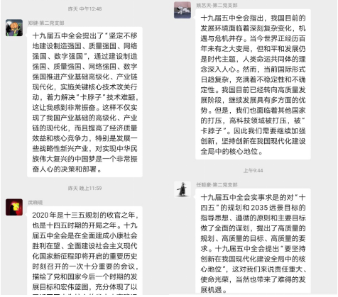 组织各学生党支部党员认真观看了中共中央举行的介绍党的十九届五中全会精神的新闻发布会,并通过支部会议和微信群等方式就关心的热点问题进行热烈讨论。