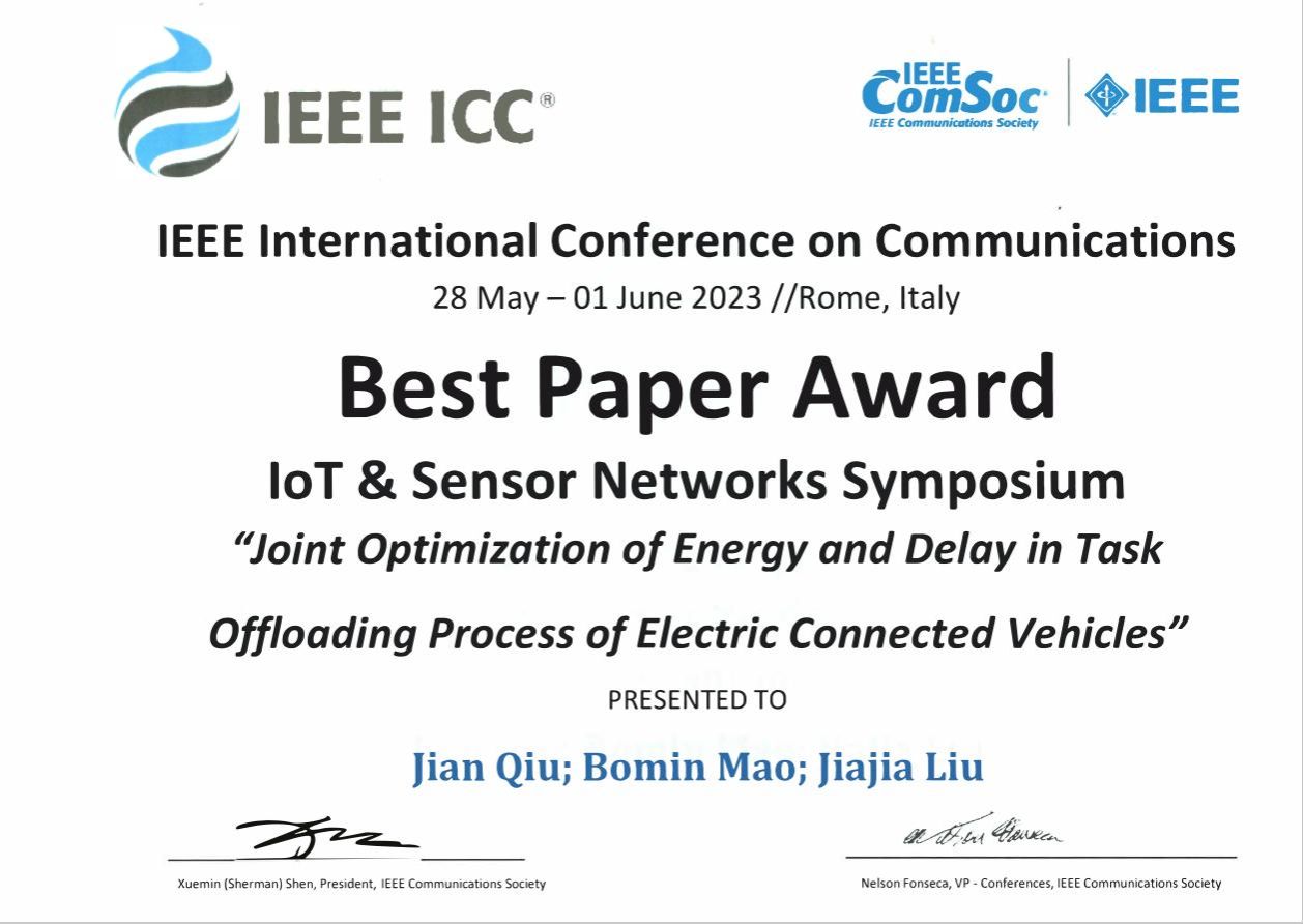 刘家佳教授团队的研究成果“Joint Optimization of Energy and Delay in Task Offloading Process of Electric Connected Vehicles”在众多论文中脱颖而出,获得了本次大会最佳论文奖。该论文黄色电影
