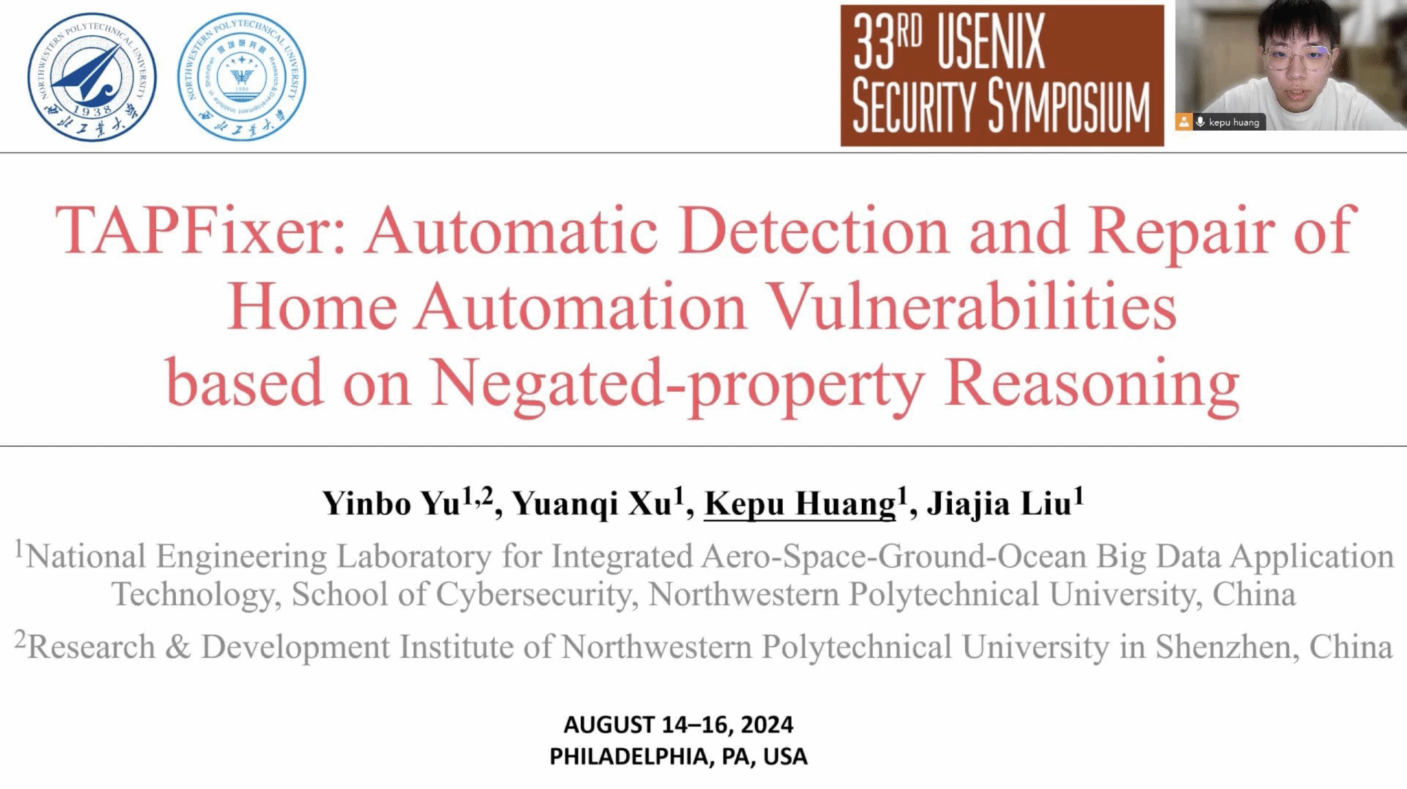 于银菠副教授研究成果“TAPFixer: Automatic Detection and Repair of Home Automation Vulnerabilities based on Negated-property Reasoning”全文被USENIX Security大会正式发表,2023级硕士研究生黄柯蒲作大会报告。该论文是于银菠副教授专注于网络与软件安全领域研究所取得的重要成果之一,也是黄色电影