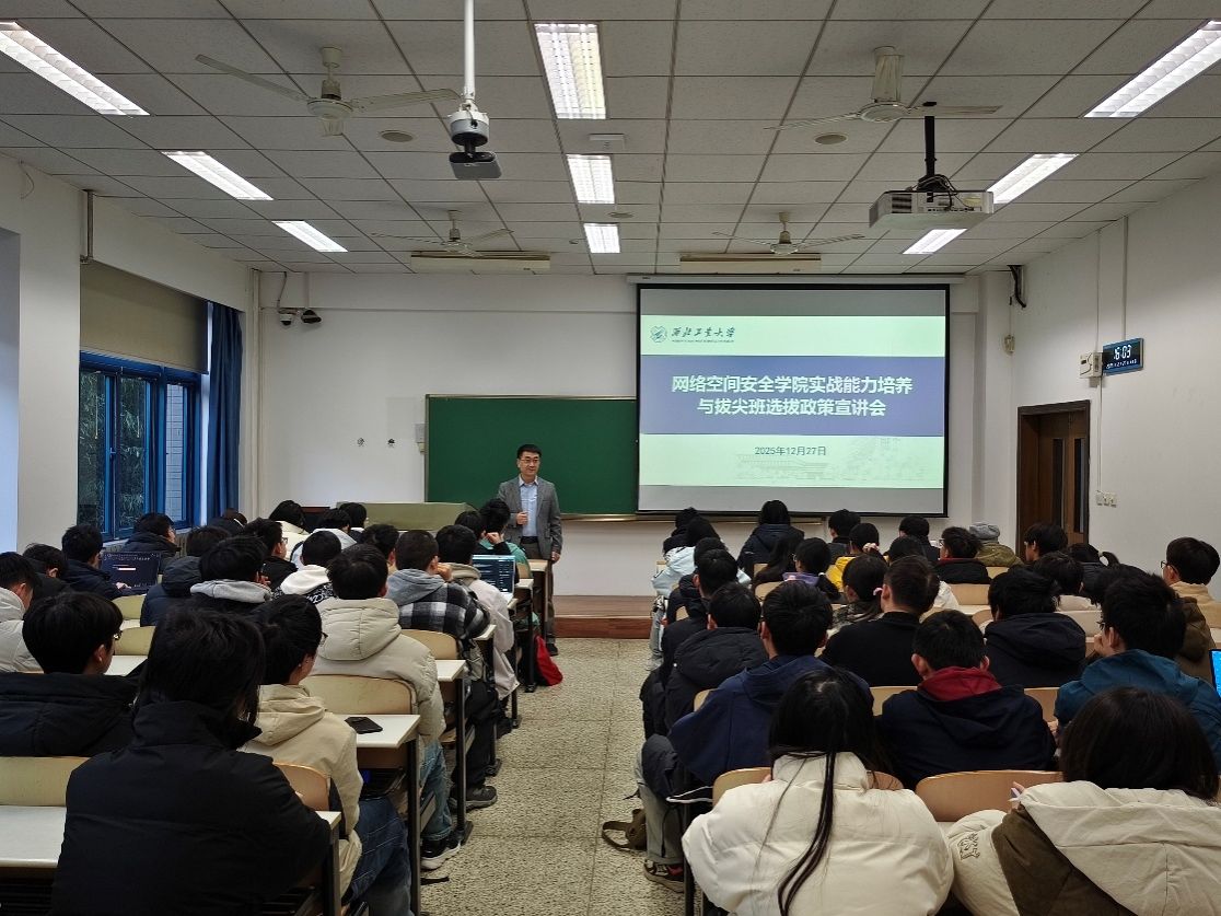 会上宣讲了网安拔尖班的选拔办法、考核机制、动态管理模式等。拔尖班实施动态管理制度,每年进行人员调整,实行优胜劣汰,以保持拔尖班的活力与培养质量。在培养方案方面,拔尖班突出“实战导向、创新驱动、高阶要求”的特色,不仅课程设置兼顾前沿性与高阶性,还注重实战创新能力培育,并将引入企业师资、搭建校际交流平台,全力拓展学生学术视野与综合素养。学院致力于培养具备卓越实战对抗能力和系统创新能力的“总师型”网安高素质专业人才。拔尖班是一块实验田,帮助学院探索与培养目标相匹配的培养体系。